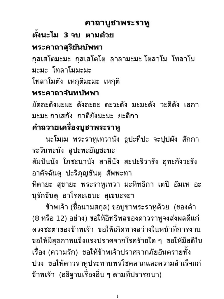 บูชาพระราหู - ข้าแต่พระราหู เทพแห่งโชคลาภอันศักดิ์สิทธิ์ที่สูงสุด ข้าขอบูชาท่านด้วยของดำ 8 อย่าง ขอให้ข้าพเจ้าปราศจากโรคภัย และอันตรายใดๆ ขอให้ท่านประทานพร .. สัตตะธา เม ผะเล มุทธา ชีวันโต นะ . ข้าแต่พระราหู เทพแห่งโชคลาภอันศักดิ์สิทธิ์ที่สูงสุด ข้าขอบูชาท่านด้วยของดำ 8 อย่าง ขอให้ข้าพเจ้าปราศจากโรคภัย และอันตรายใดๆ ขอให้ท่านประทานพร . การเตรียมของไหว้พระราหู เป็นของคาวและของหวานสีดำหรือสีม่วง 8 อย่างหรือตามกำลังที่มี เช่น ข้าวเหนียวดำ, ถั่วดำ, ไก่ดำ, ไข่เยี่ยวม้า, ไข่พะโล้, . บอกวิธีบูชาพระราหูที่ถูกต้อง วิธีบูชา ขอพร และสะเดาะเคราะห์ ต้องทำอย่างไรจึงถูกต้องโดยครั้งนี้พาไปไหว้พระราหูกันที่ วัดศีรษะทอง . กินนุ สันตะระมาโน วะราหุ สุริยัง ปะมุญจะสิ.
